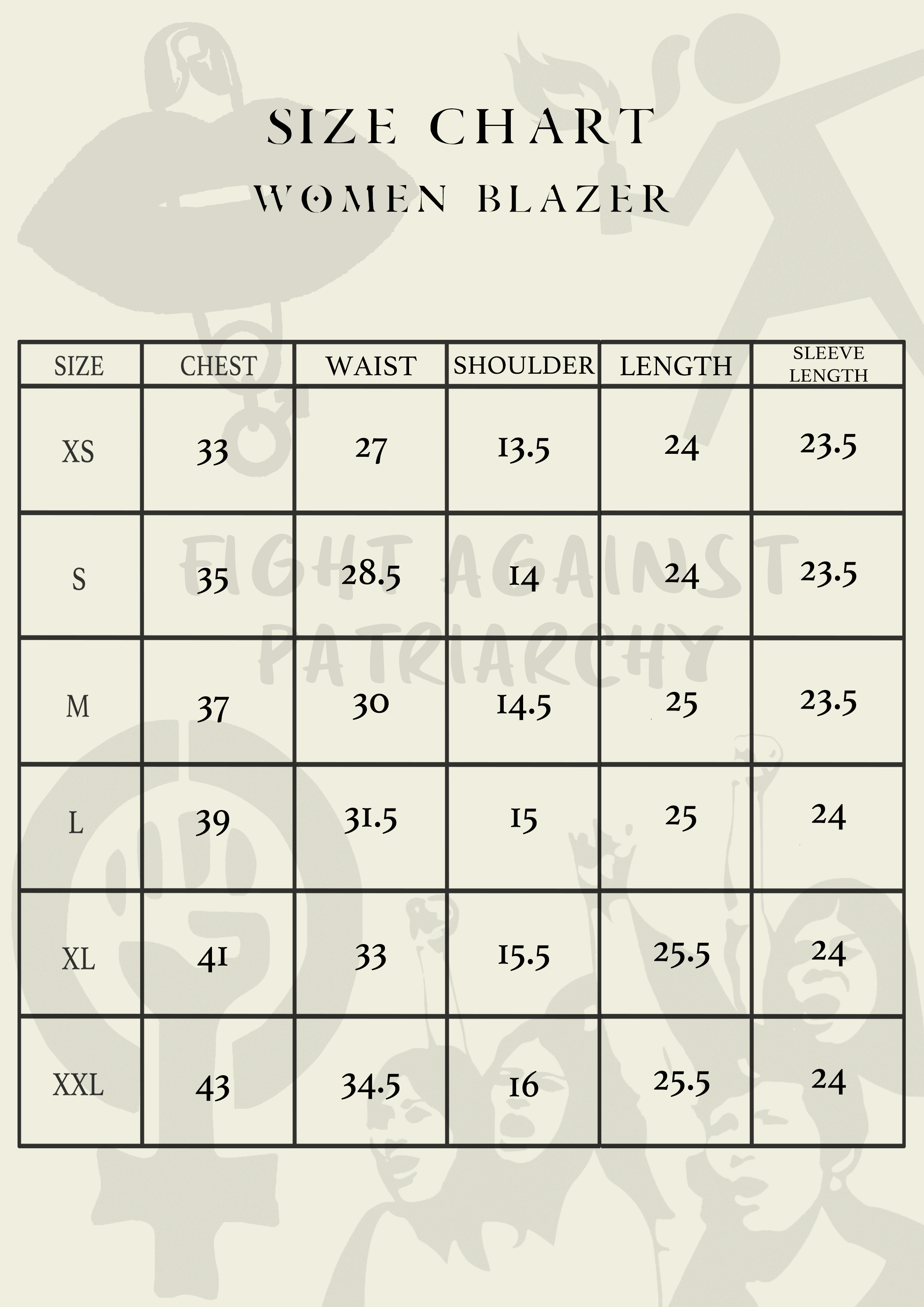 Size guide reflects garment measurements in inches.
