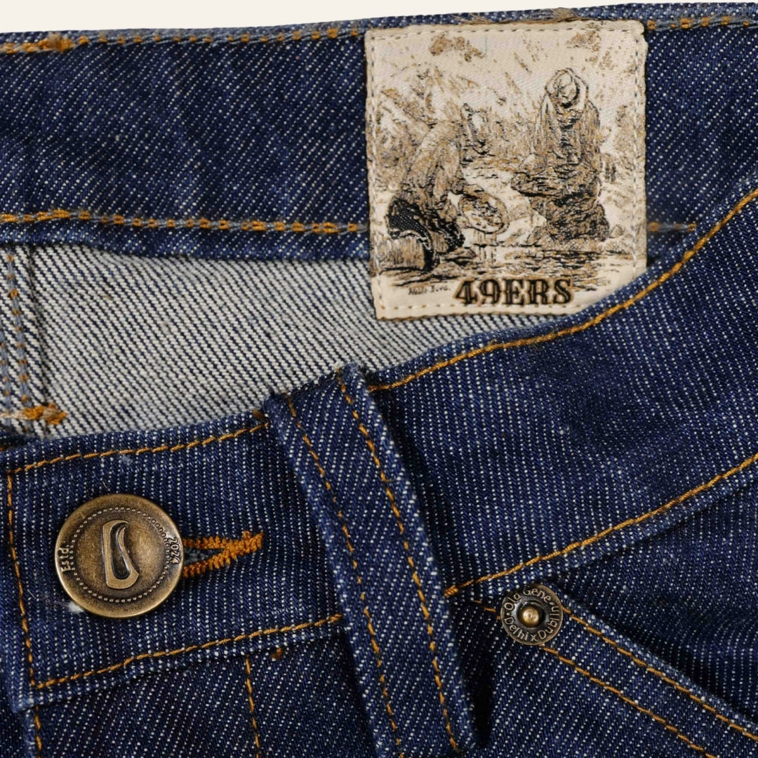 · Back Pocket Tag : The back pocket tag shows twoidentical men, each holding gold and a gun symbolising the frenzy and duality of the Gold Rush. At the center, a gold bag stamped with our logo reflects the reward we all chase just like the perfect pair of jeans.